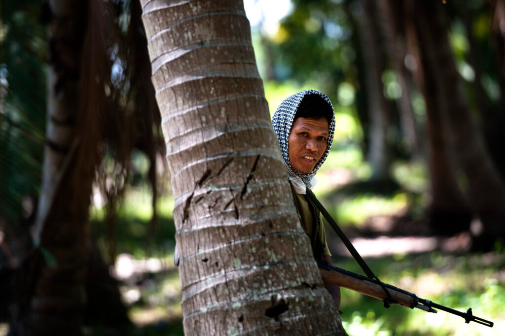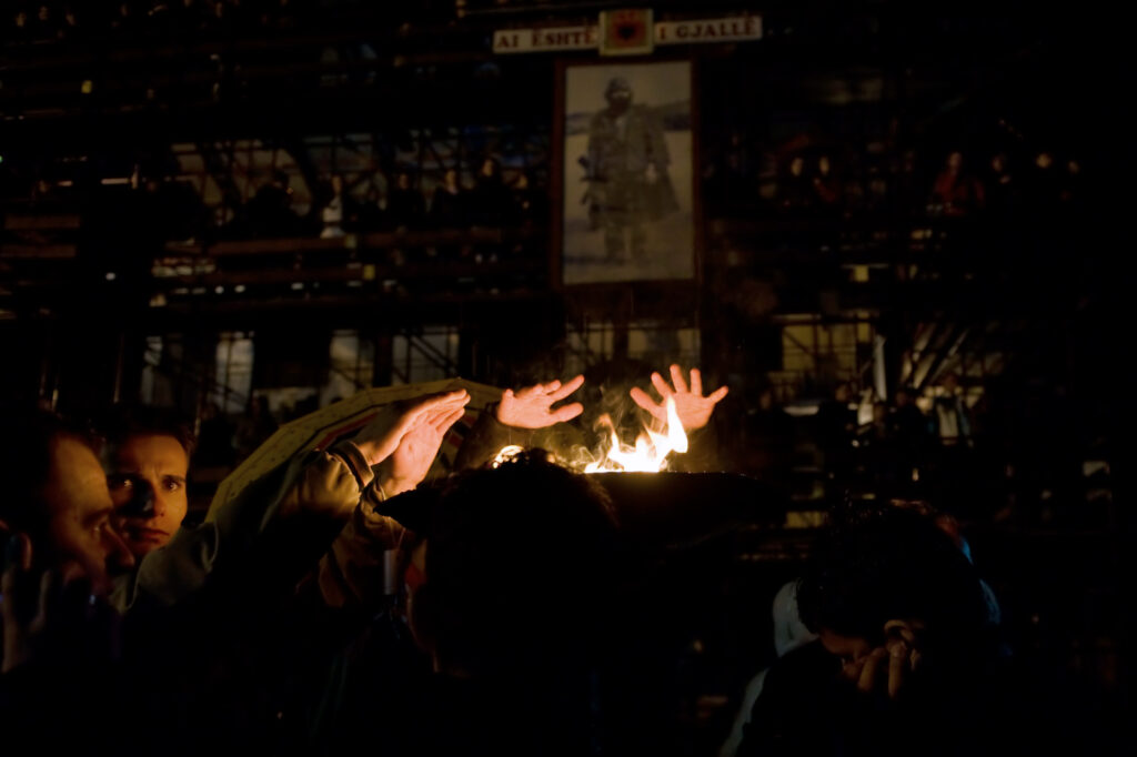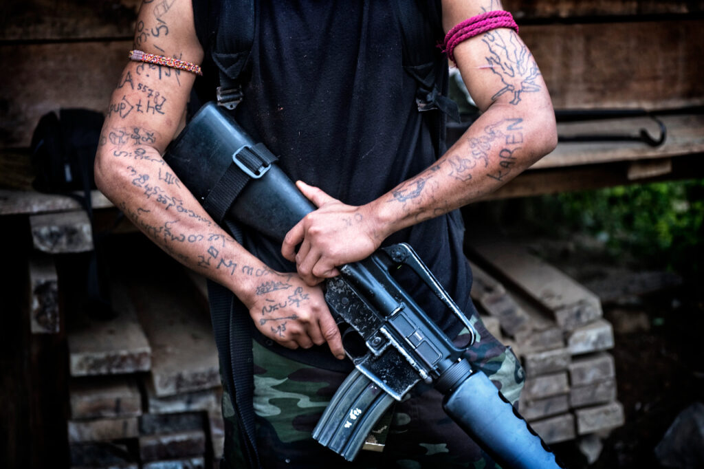 A fighter of the Karen National Liberation Army (KNLA) holds his rifle, his arms inked with sacred texts and protective charms. For many Karen fighters, these tattoos serve as both spiritual armour and a declaration of identity in their decades-long struggle for autonomy.Prekaz, Kosovo, 2008.
