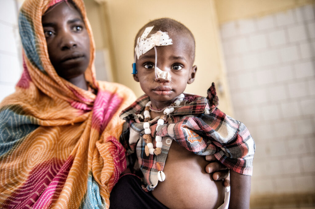 A severely malnourished child, 22-month-old Olud Mohammad, receives care at a nutrition unit in Aleg, Mauritania. A nasogastric tube is used for feeding and administering drugsChitwan District, Nepal, 2012.