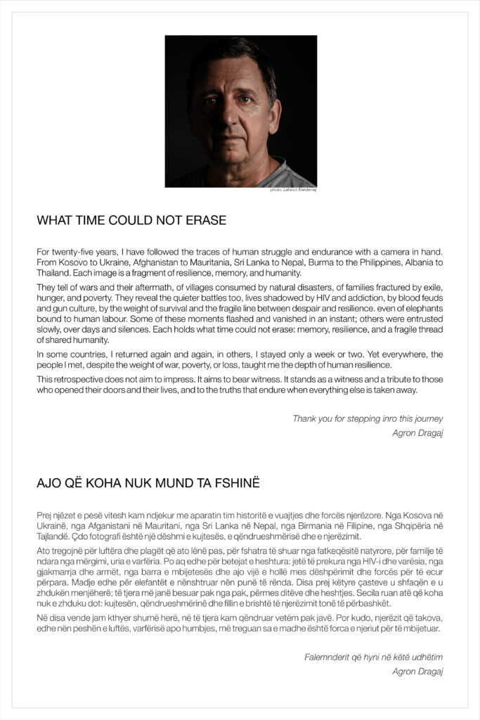 Prej njëzet e pesë vitesh, kam ndjekur gjurmët e përpjekjes dhe qëndresës njerëzore me kamerën në dorë. Nga Kosova në Ukrainë, nga Afganistani në Mauritani, nga Sri Lanka në Nepal, nga Burmа në Filipine, nga Shqipëria në Tajlandë. Çdo imazh është një fragment qëndrueshmërie, kujtese dhe njerëzimi.
