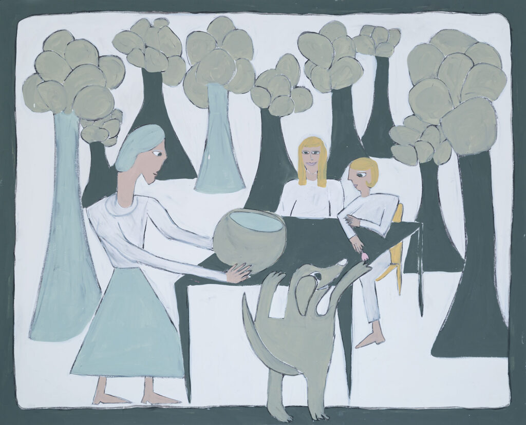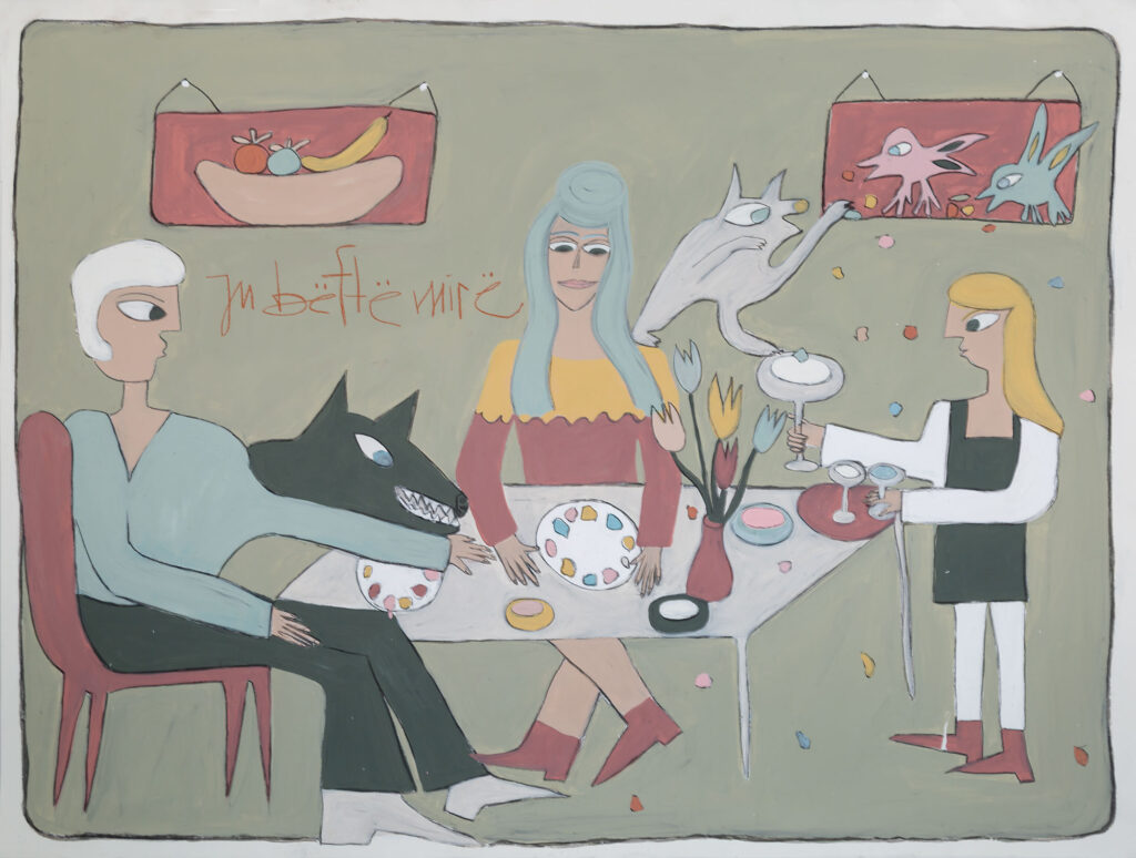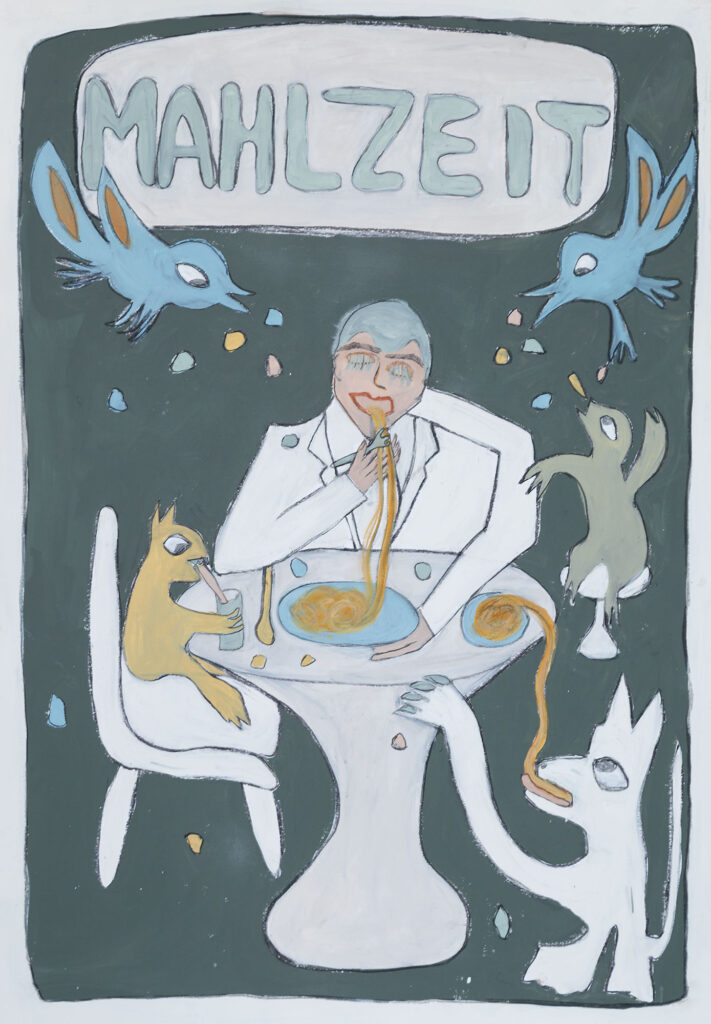 Njëra nga veprat e ekspozitës të artistes austriake Katja Berger e titulluar “MAHLZEIT”, mbase më së miri përfaqëson frymën e krijimtarisë së saj. Për këtë frymë vetë artistja shprehet me fjalët: “Arti im fokusohet në përmbajtje, posaçërisht në eksplorimet e përmasava emocionale dhe të brendësive të njerëzve dhe kafshëve.” “Mahlzeit” në esencë është alegori satirike. Në këtë ilustrim shohim një tryezë ku është ulur një zotni me kostume të bardha të zengjinit duke e ngrënë kryevaktin, që në këtë rast janë shpagetat, ushqim jo edhe aq ekskluziv, por që zotnia i hanë me kënaqësinë e grykësit, sikur para vetës e ka shujtën më përallore. Ndërkaq, dhe këtu është poenta e veprës, rreth tryezës sillen kafshët dhe zogjët, duke u përpjekur që edhe ato të kapin dromcat e ushqimit dhe pijeve. Qartë, kemi një alegori mbi tryezën e botës të sotme, ku ka ushqim të mjaftueshëm për të githë, por vetëkënaqësia e pasanikëve, e bënë botën të padrejtë, të sunduar nga grykësia e tyre e pangopshme.